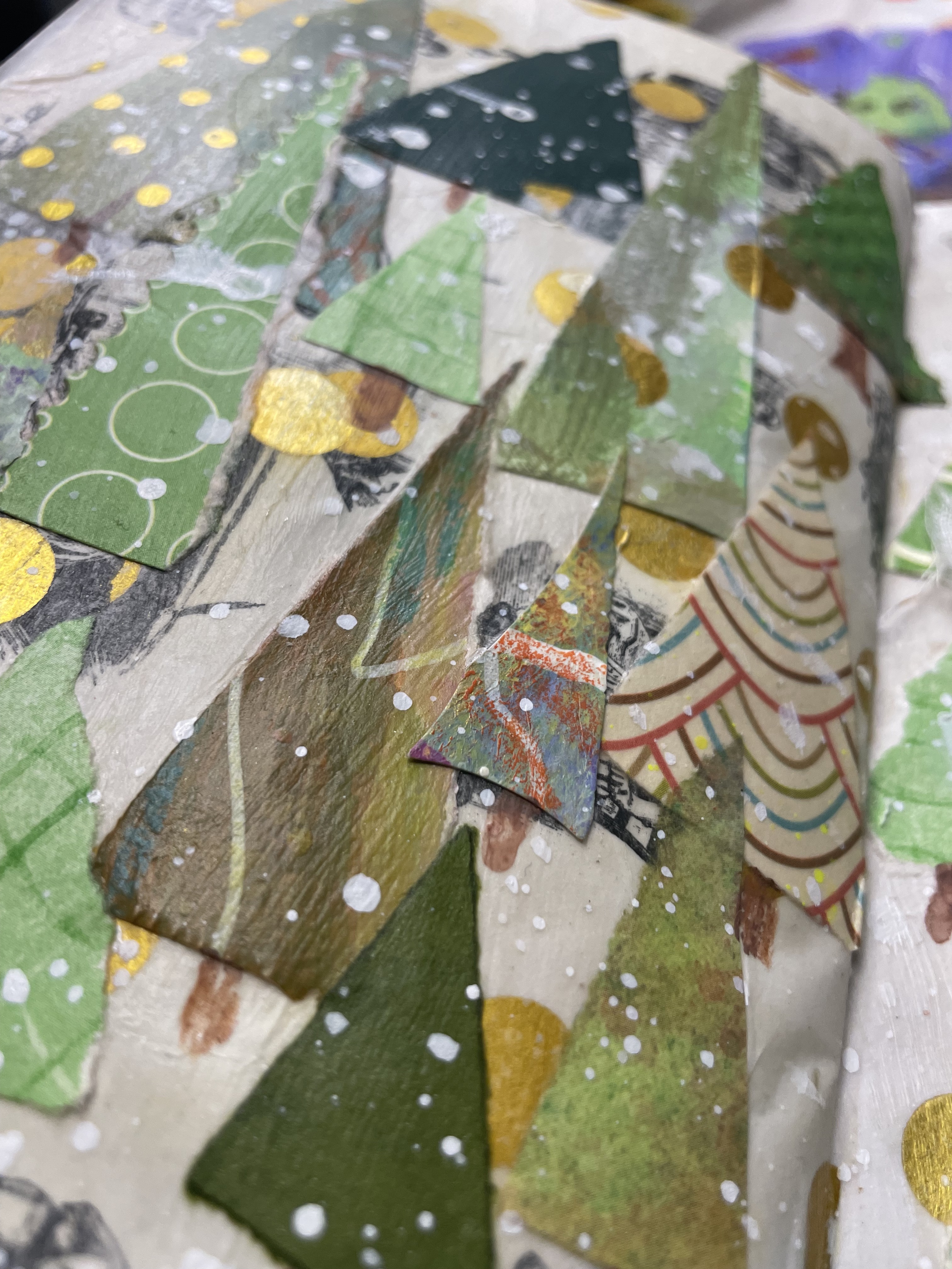 Try using paper scraps to collage Christmas trees or other holiday motifs in your Art Journal